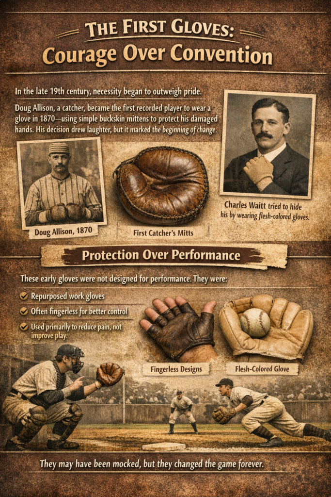 Doug Allison, a catcher, became the first recorded player to wear a glove in 1870—using simple buckskin mittens to protect his damaged hands. His decision drew laughter, but it marked the beginning of change.