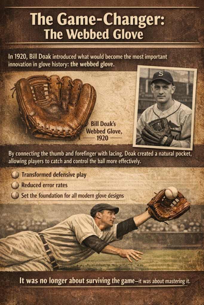 In 1920, Bill Doak introduced what would become the most important innovation in glove history: the webbed glove.