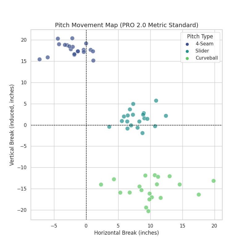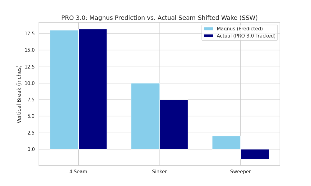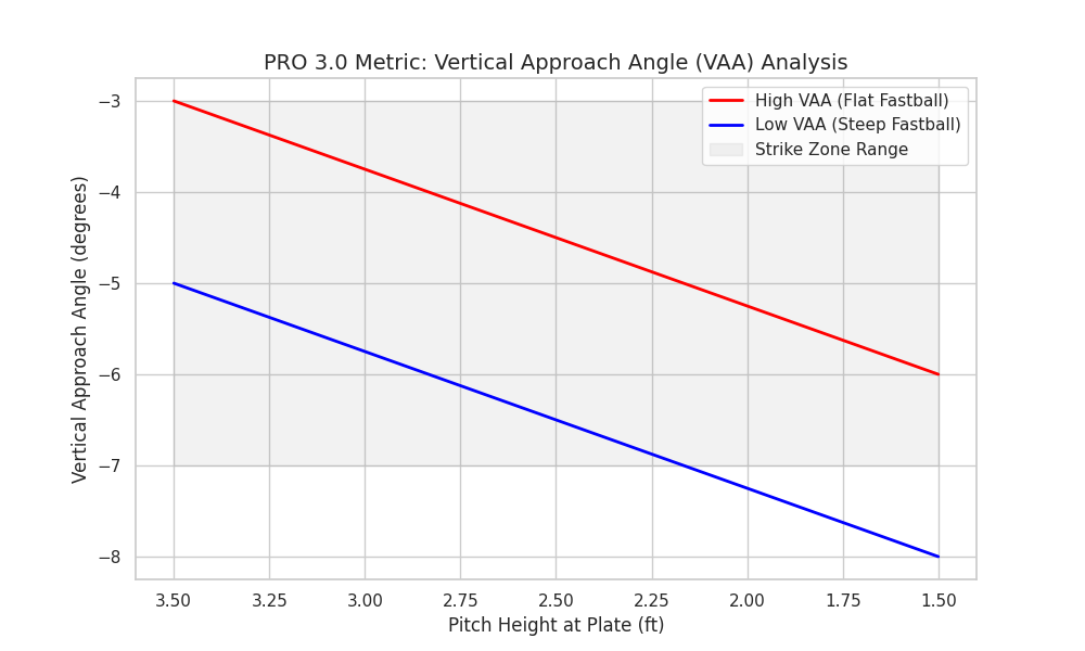 The true “3.0” breakthrough is captured in PRO 3.0: Magnus vs. Seam-Shifted Wake (Figure 5), which identifies movement caused by air hitting the seams—forces previously invisible to 2.0 radar. Finally, the Vertical Approach Angle (VAA) Analysis (Figure 6) provides the modern hitter’s perspective, proving that a pitch’s entry angle is often more dominant than its velocity. Together, these metrics transform the mound into a high-precision laboratory for elite performance.