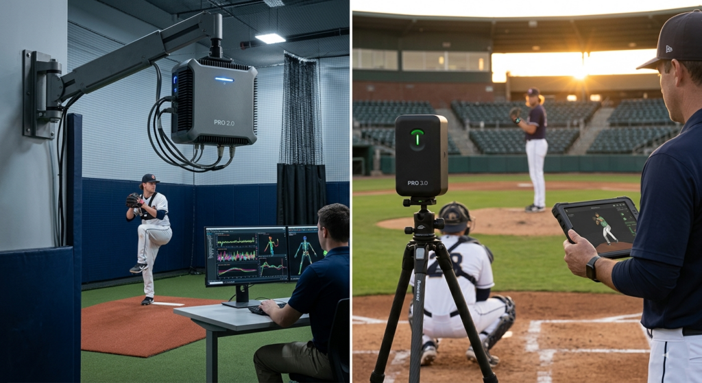 In stark contrast, the emerging PRO 3.0 framework (Figure 2) prioritizes wireless mobility and “all-in-one” integration. These compact, battery-powered devices replace server rooms with cloud processing, allowing elite technology to move seamlessly from the laboratory to the active dugout, putting real-time intelligence directly in the coach’s hand.